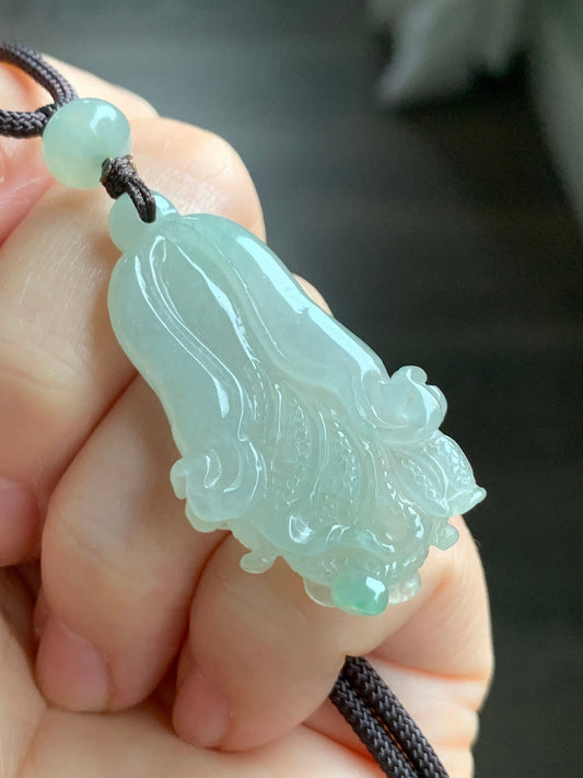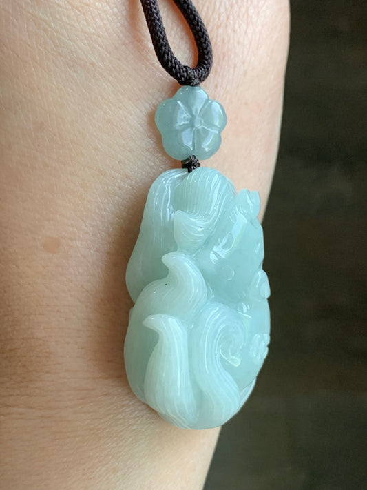 LARGE Natural Translucent Light Blue Jadeite 3D Carved Sleeping Nine-Tailed Fox Pendant Rope Necklace 25” 28g 天然糯冰浅蓝翡翠九尾睡狐吊坠