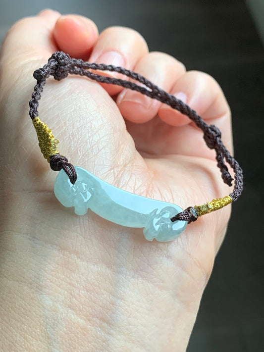 Natural Icy Translucent Light Green Jadeite Carved Dragon Hook Rope Braided Bracelet Adjustable 6"-9" 天然白冰晴底翡翠龙钩手绳