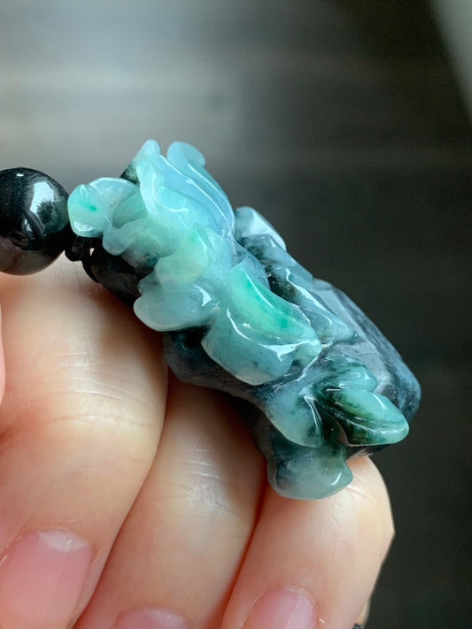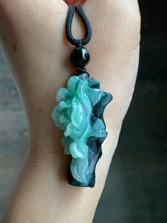 Natural Icy Translucent Bicolored Jadeite Carved Magnolia Tree Branch Flower Rope Necklace Adjustable 28” 36g 天然墨翠加冰晴飘绿花翡翠枯木逢春挂件