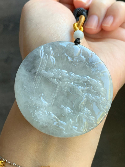 Large Natural Icy Translucent Light Wuji Marbled Jadeite Shan Shui Scenery Landscape Pendant Rope Necklace 39g 天然冰乌鸡翡翠山水牌吊坠