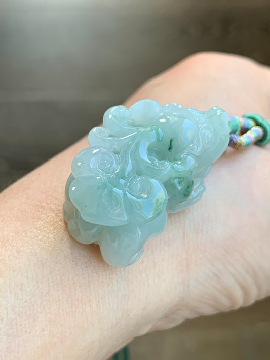 Natural Grade A Icy Translucent Gelatinous Green Marbled Jadeite Carved Pixiu Pendant Rope Necklace Adjustable 25" 24g 天然冰胶精工飘绿花翡翠貔貅吊坠