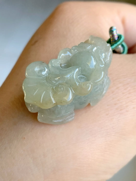 Large Natural Grade A Icy Translucent Light Green Golden Jadeite Carved Pixiu Pendant Rope Necklace Adjustable 天然冰胶晴色翡翠带吧貔貅吊坠