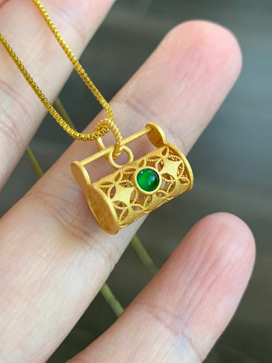 Natural Guatemalan Premium Vibrant Green Jadeite 3D Lock Pendant S925 Silver Yellow Gold Finish w/ Chain 天然高冰危绿翡翠银镶立体锁包吊坠套链