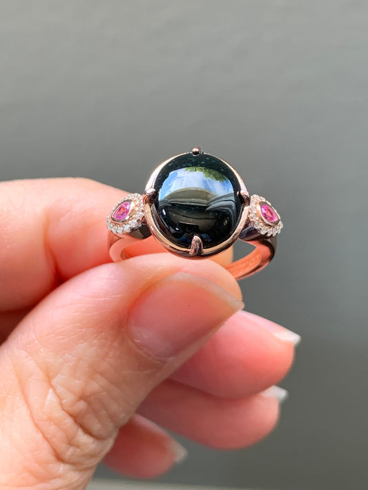 Certified Natural Icy Translucent Intense Black Jadeite Oval Ring S925 Sterling Silver Rose Gold Finish 天然墨翠透绿银镶戒指 MC300