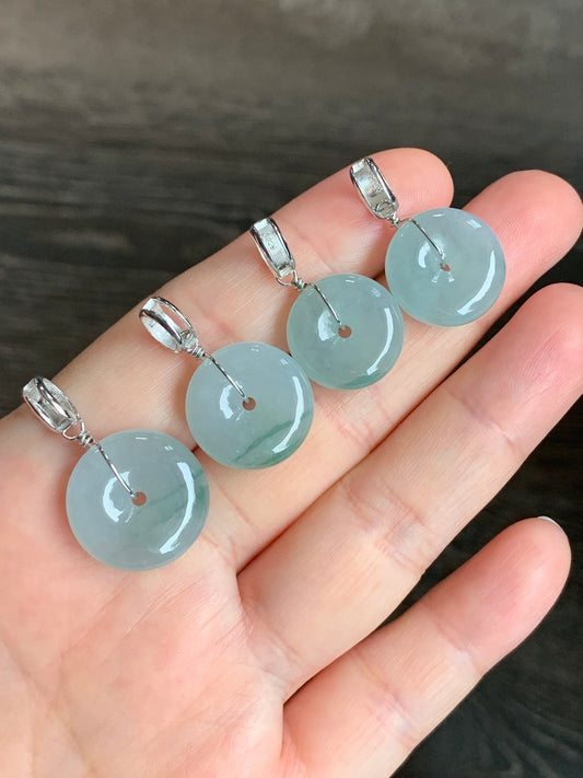 Natural Icy Translucent Gelatinous Light Green Jadeite w/ Green Marbling Ping An Kou Donut Pendant Sterling Silver 天然糯冰晴底飘花翡翠平安扣吊坠