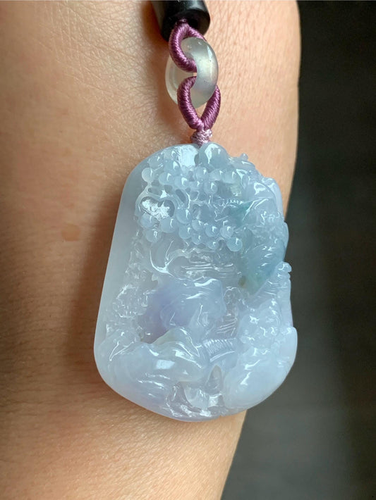 Large Natural Icy Highly Translucent Gelatinous Purplish Blue Jadeite Carved Shan Shui Pai Landscape Pendant 天然冰胶蓝紫飘花翡翠大山水牌吊坠