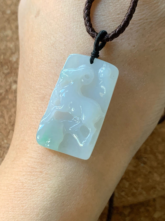 Certified Natural Translucent Gelatinous Icy White & Green Jadeite Carved Goat Pendant Rope Necklace Adjustable 天然冰胶玛瑙底白加绿翡翠羊牌吊坠