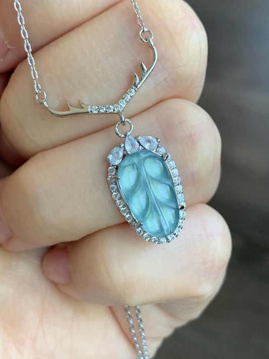 Natural Guatemalan Highly Translucent Sky Blue/Light Blue Jadeite Carved Leaf Antler Design Necklace S925 Silver 16” 天然冰危天空蓝翡翠大叶有成银镶项链