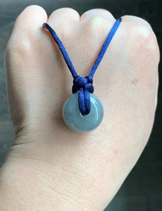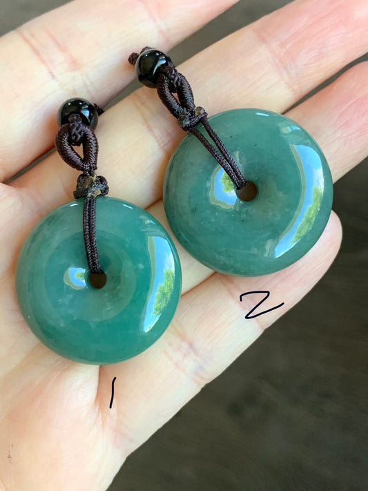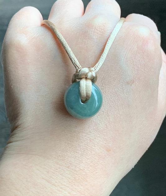 Natural Guatemalan Icy Translucent Teal Green Jadeite Ping An Kou Donut Bead Pendant Rope Necklace 天然冰危蓝绿翡翠平安扣吊坠