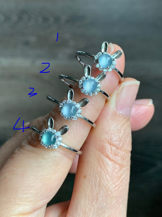 Natural Guatemalan Icy Highly Translucent Light Blue Jadeite Solitaire Rabbit Design Ring S925 Silver Size Adjustable 天然冰蓝起光翡翠小兔银镶戒指 XTW50