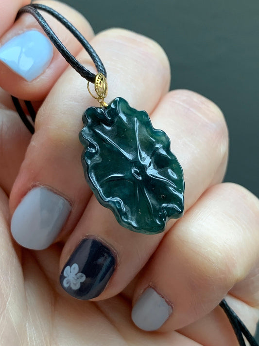 Natural Icy Translucent Dark Teal Green Jadeite Oval Pendant Carved w/ Lily Pad 18K Yellow Gold Bail 天然冰湖水绿翡翠荷叶吊坠