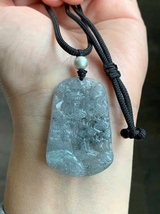 Natural Icy Translucent Wuji Jadeite Shan Shui Landscape Scenery Pendant Rope Necklace 27" Adjustable 15g 天然冰胶乌鸡翡翠山水牌吊坠项链