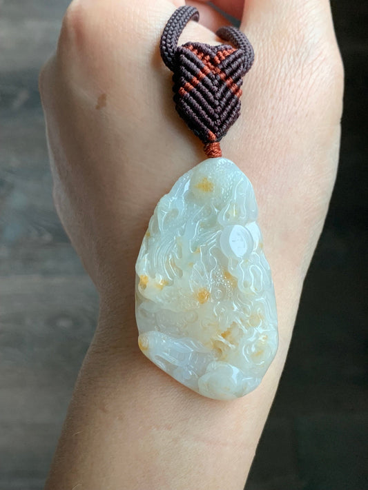 Natural Icy Translucent Beige Jadeite w/ Orange Marbling Carved Dragon Double Sided Pendant Rope Necklace 24" 27g 天然桂花糕翡翠精工龙牌双面雕吊坠