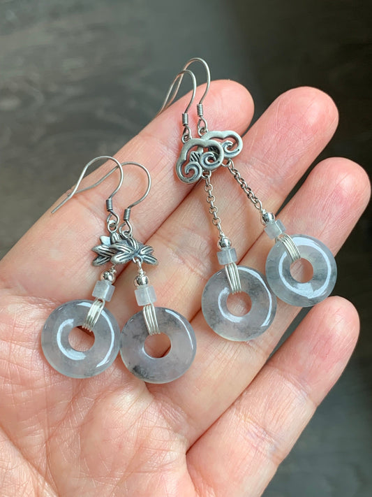 Natural Icy Translucent Gelatinous Wuji Jadeite Ping An Kou Donut Dangle Earrings Retro Style 925 Sterling Silver 天然A货冰胶乌鸡翡翠平安扣银耳吊