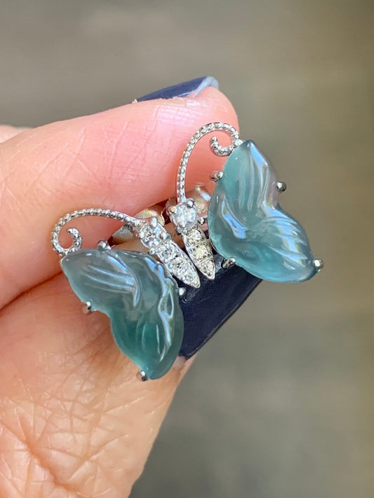 Natural Guatemalan Icy Translucent Dusty Teal Blue Jadeite Butterfly Style Stud Earrings S925 Sterling Silver 天然冰危蓝绿翡翠蝴蝶镶嵌耳钉