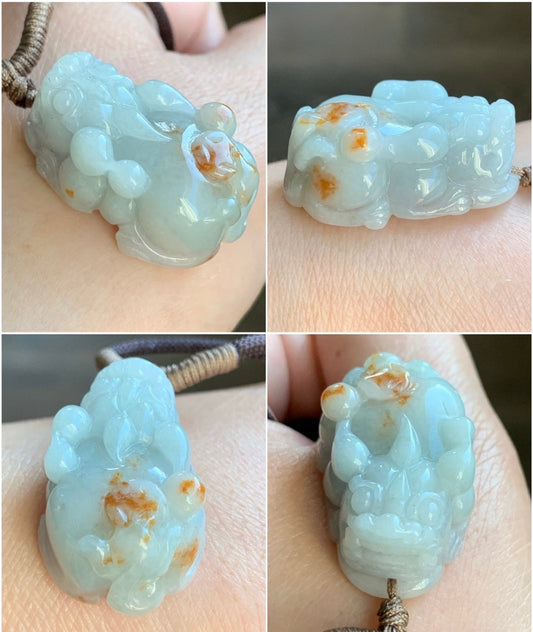 Natural Icy Translucent Golden Orange Marbled Jadeite Carved Pixiu Pendant Rope Necklace 30" 18g Adjustable 天然撒金翡翠精工貔貅吊坠