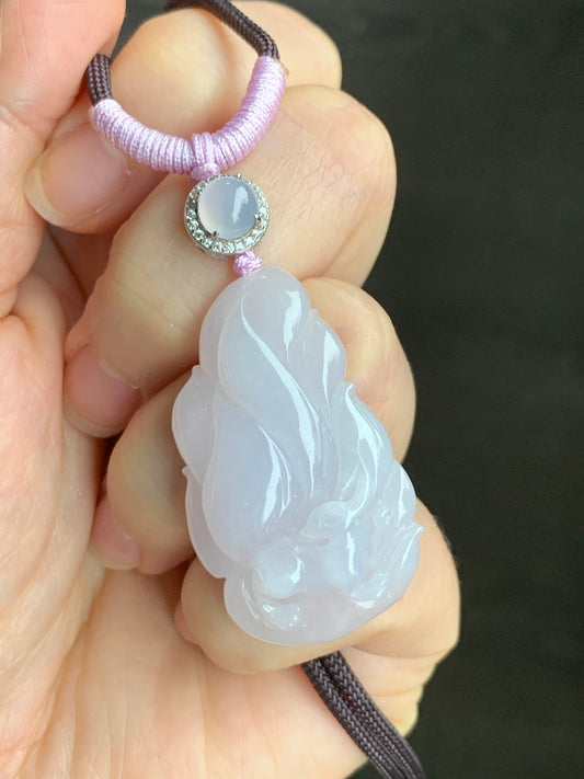 Certified Natural Grade A Icy Translucent Pastel Pinkish Purple Jadeite Carved Nine-Tailed Fox Pendant Rope Necklace 27” 天然冰胶淡粉紫翡翠九尾狐吊坠 3269