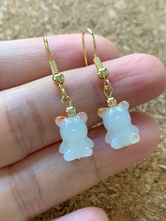 Natural Icy Jadeite Carved Teddy Bear Dangle Earrings 14K YG or Silver Plated 天然翡翠小熊14K包金耳吊