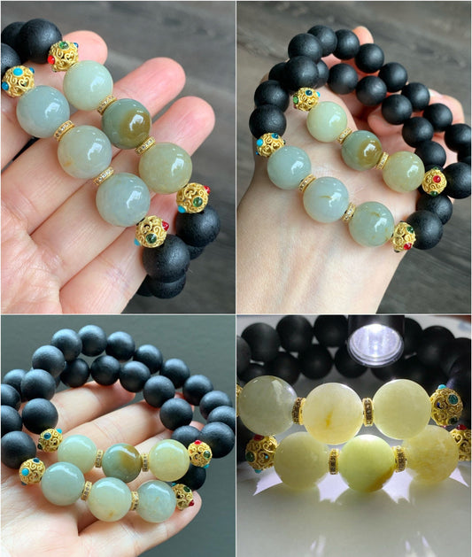 Large Natural Icy Translucent Jadeite and Natural Black Agarwood Beaded Bracelet 7.75" 天然糯冰翡翠圆珠土沉香木珠手串