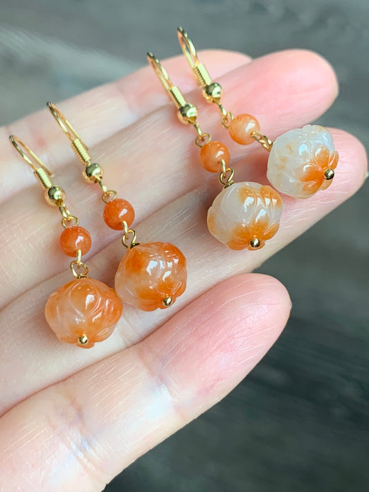 Genuine Icy Translucent Gelatinous White Jadeite w/ Red Marbling Lotus Flower Dangle Earrings 14K Gold Filled 冰胶烧红翡翠莲花包金耳钩