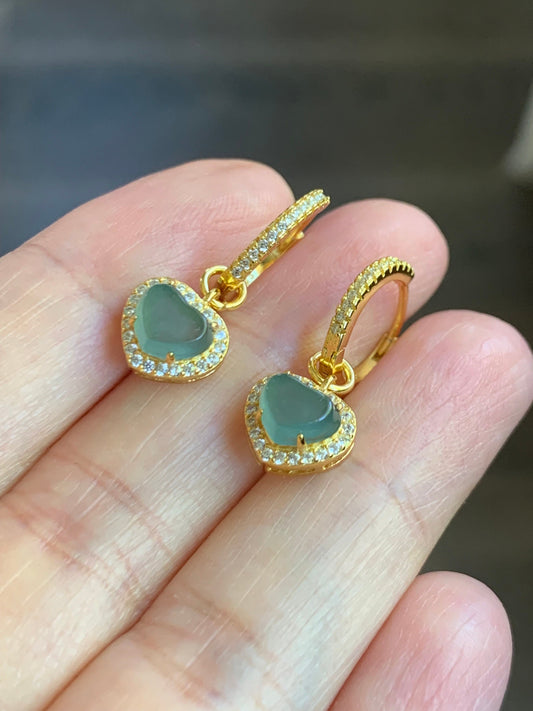 Natural Guatemalan Icy Translucent Light Teal Blue Jadeite Faceted Hearts Hoop Huggie Earrings Sterling Silver Gold Finish 天然冰危蓝翡翠爱心切割面银镶耳包
