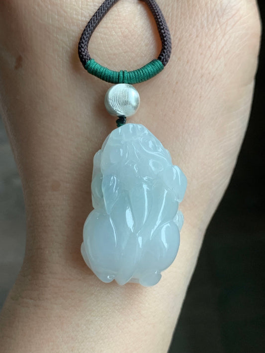 Natural Icy Translucent Gelatinous White Jadeite Pixiu Pendant Rope Necklace Sterling Silver 26" Adjustable 20g 天然白冰胶玛瑙底飘绿翡翠貔貅吊坠