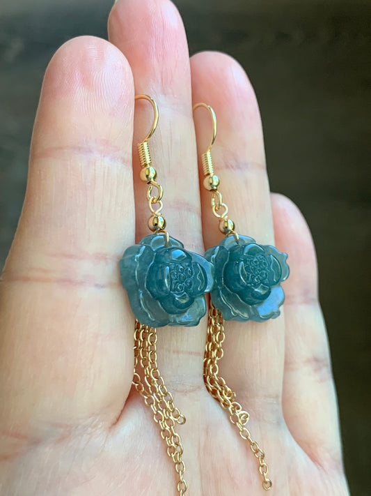 Natural Guatemalan Icy Translucent Rich Blue Jadeite carved lotus flower Dangle Earrings 14K Yellow Gold Plating 天然冰危蓝翡翠莲花14K包金耳吊