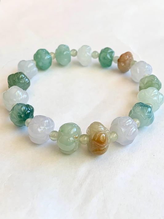 Natural Icy Translucent Gelatinous Multicolored Jadeite Carved Lotus Flower Beads Beaded Bracelet 7” 25g 天然冰胶多宝翡翠莲花珠手串 LHZDW
