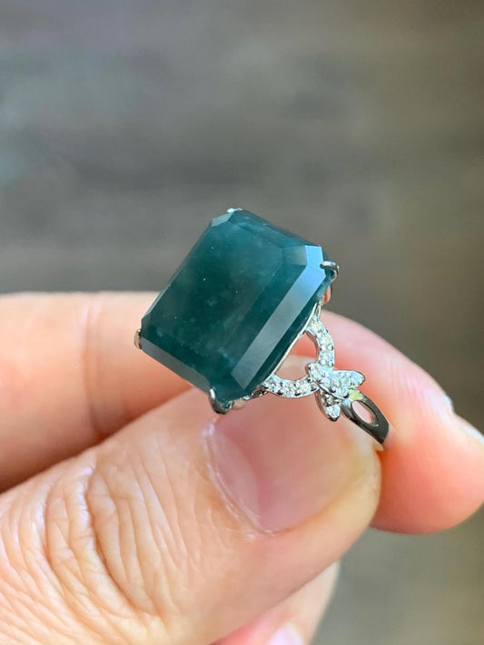 Large Natural Guatemalan Icy Translucent Dark Teal Blue Jadeite Faceted Emerald Cut Ring Sterling Silver Adjustable 天然冰危深蓝切割面翡翠银镶戒指 WQG80A