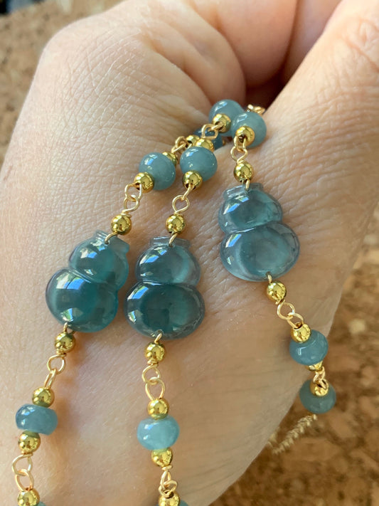 Natural Guatemalan Icy Highly Translucent Teal Blue Jadeite Carved Hulu Gourd Bracelet 14K Gold Plated adjustable 7.25” 天然冰危蓝绿翡翠葫芦14K包金手链