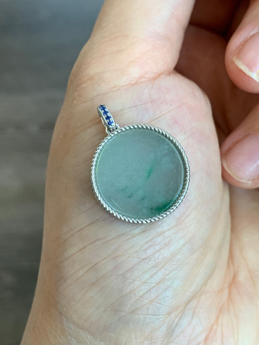 Certified Natural Icy Translucent Light Green Jadeite w/ Green Marbling Wu Shi Pai Pendant Sterling Silver 天然莫西沙晴飘绿翡翠无事牌镶嵌吊坠