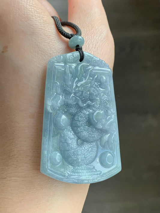 Certified Natural Guatemalan Icy Translucent Light Dusty Blue Jadeite Carved Dragon Pendant Rope Necklace 33" Adjustable 天然冰危蓝紫翡翠龙牌吊坠 3272