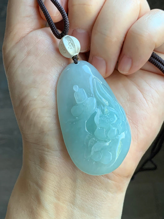 Natural Icy Translucent Light Blue Jadeite Wu Dao Lotus Flower Enlightenment Pendant Necklace Sterling Silver 33g 天然冰胶淡蓝翡翠莲花悟道足银吊坠