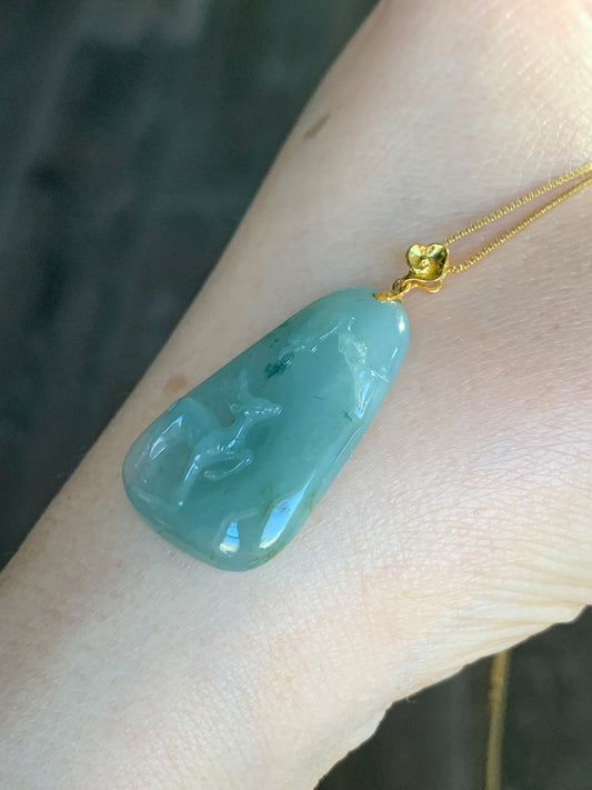 Certified Natural grade A Icy Translucent Green Jadeite Deer Engraved Pendant with 18K Yellow Gold Bail 天然翡翠正冰满绿飘花鹿牌镶嵌吊坠