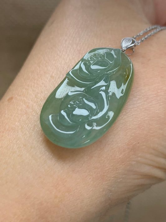 Natural grade A Icy Translucent Green and Yellow Blended Jadeite Lotus Flowers Pendant with 18K White Gold Bail 天然翡翠正冰双莲花镶嵌吊坠
