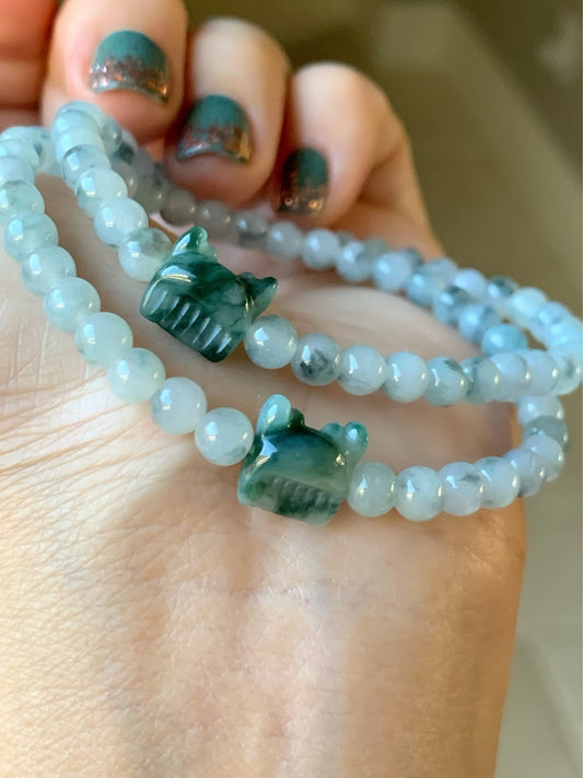 Natural Icy Translucent & Gelatinous Green Marbling Jadeite Carved Deer Antler Comb Bead Beaded Bracelet 7” 天然冰飘花翡翠鹿角梳子手串