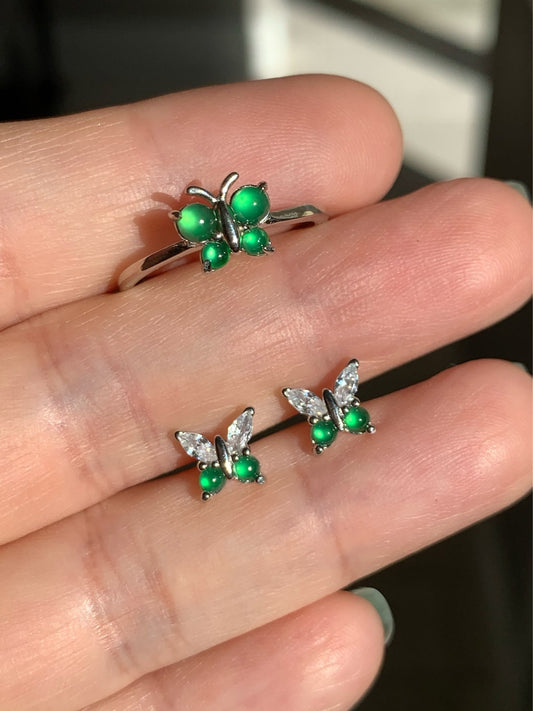 Natural Guatemalan Icy Highly Translucent Vibrant Green Jadeite Butterfly Design Ring or Stud Earrings S925 Silver 天然老种高危阳绿翡翠蝴蝶银镶 WHD100