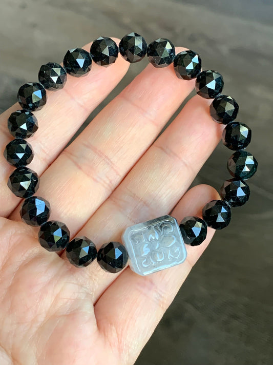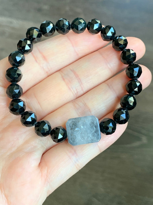 Natural Icy Translucent Wuji Jadeite w/ Retro Floral Engraving Black Jadeite Faceted Beads Beaded Bracelet 6.75” 天然墨翠圆珠冰乌鸡翡翠手牌手串