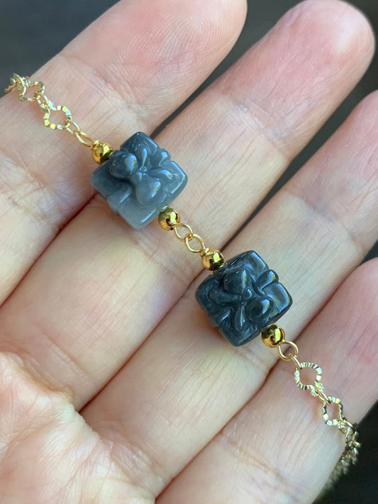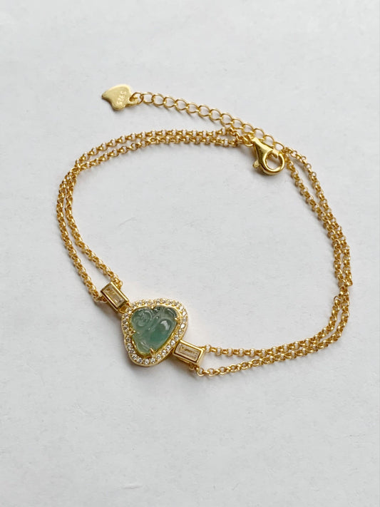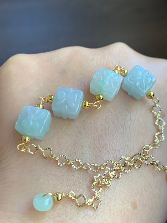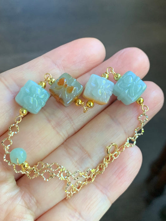 Holiday Special Natural Icy Wuji Jadeite Carved Gift Boxes 14K YG Plated Chain Bracelet Adjustable up to 7.5” 天然乌鸡翡翠礼物包金手链