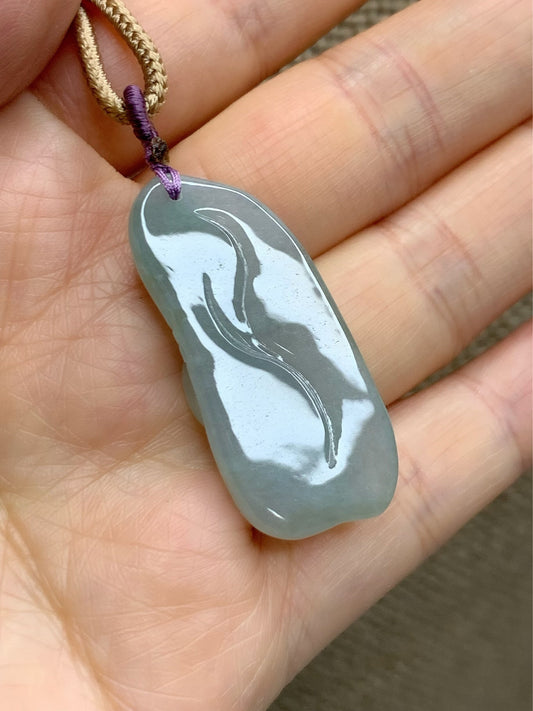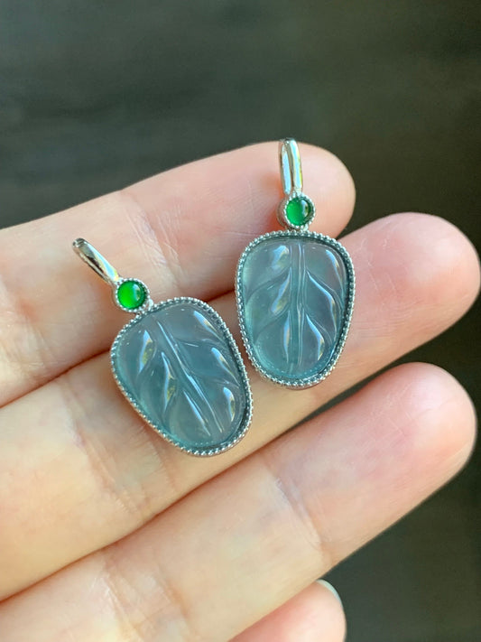 Natural Guatemalan Icy Highly Translucent Light Dusty Blue & Vibrant Green Jadeite Leaf Pendant Sterling Silver 天然冰蓝翡翠大叶有成镶嵌吊坠