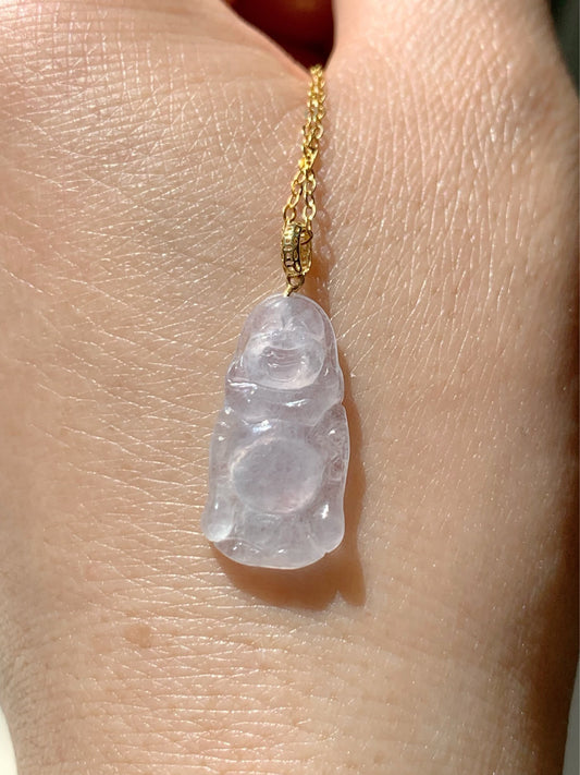 Natural Premium Transparent Icy Jadeite Light Pink Undertone Buddha Petite Pendant 18K Yellow Gold 天然老种正高冰起光冰粉底翡翠站佛镶嵌吊坠