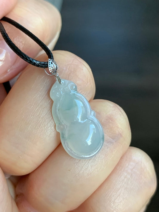 Natural Icy Translucent Gelatinous Light Green Marbling Jadeite Gourd Hulu Pendant 18K White Gold Bail 17” Cord 天然淡冰飘花翡翠葫芦镶嵌吊坠