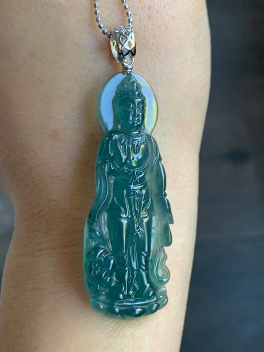 Certified Natural Guatemalan Icy Highly Translucent Gelatinous Rich Teal Green Jadeite Guanyin Pendant Sterling Silver 天然冰胶危深蓝绿翡翠观音吊坠 5138