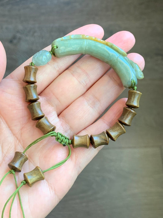 Natural Translucent Dusty Green Jadeite w/ Yellow Marbling Bamboo Cuff Green Sandalwood Beaded Bracelet 6.75” 21g 天然黄加绿翡翠竹节绿檀木手串