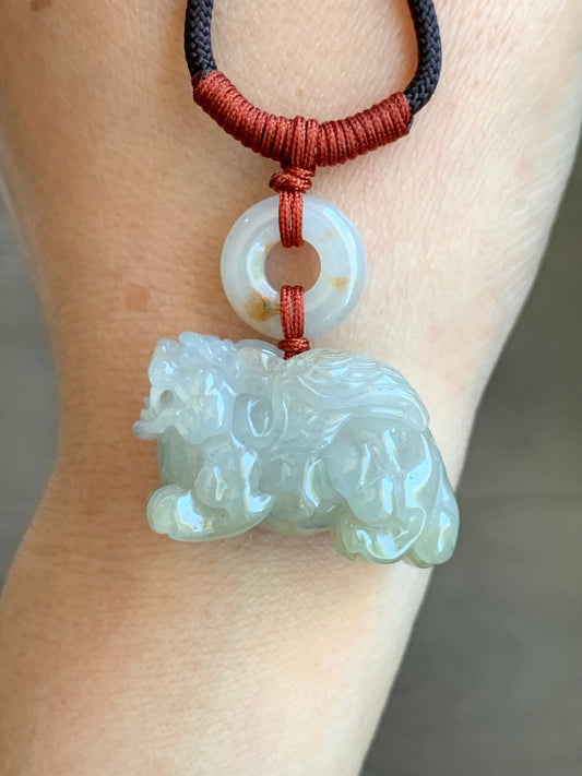 Natural Icy Translucent Gelatinous Light Beige Jadeite w/ Golden Marbling Flying Pixiu & Donut Pendant Necklace 天然冰糖黄撒金翡翠飞天貔貅平安扣项链