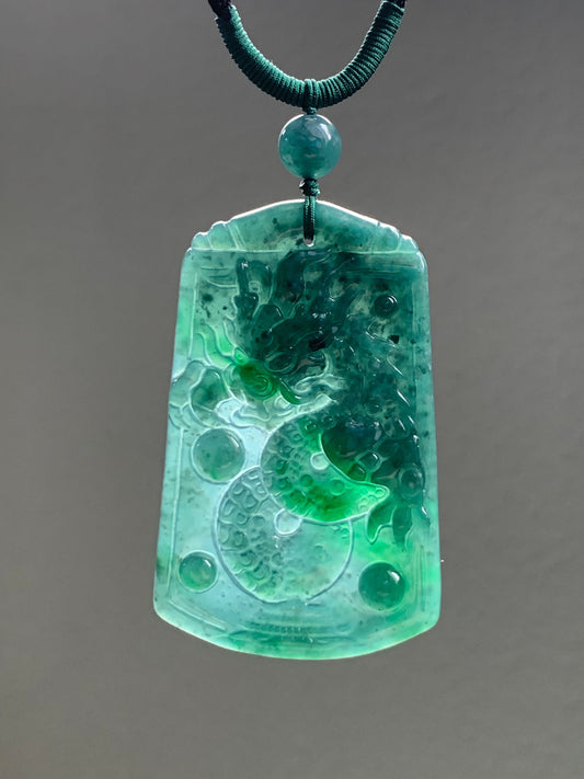 Natural Guatemalan Icy Translucent Teal Green Jadeite Vibrant Green Marbling Dragon Pendant Rope Necklace 32" Adjustable 21g 天然冰危湖水蓝飘绿翡翠龙牌吊坠