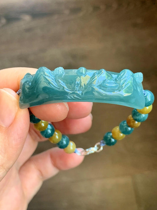 Natural Guatemalan Icy Translucent Dusty Teal Blue Jadeite Shan Shui Cuff Blue & Yellow Jadeite Beads Beaded Bracelet 6.5” 19g 天然冰危蓝翡翠山水牌手串