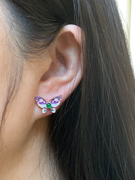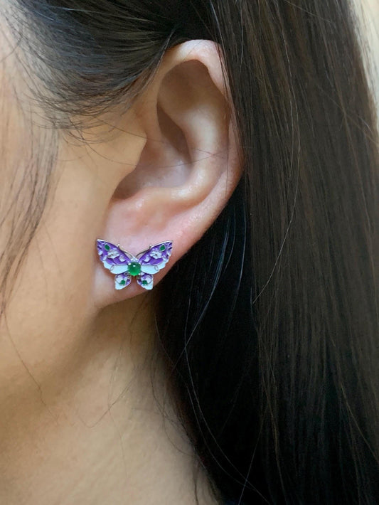 Natural Grade A Guatemalan Icy Translucent Vibrant Green Jade Jadeite Butterfly Enamel Earrings Sterling Silver 天然冰危绿翡翠银镶蝴蝶烤漆耳钉 KQHJ66