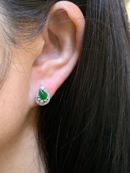 Natural Guatemalan Grade A Icy Translucent Vibrant Green Jade Jadeite Teardrop Stud Earrings Sterling Silver 天然冰危绿翡翠水滴蛋面镶嵌耳钉 LSD77