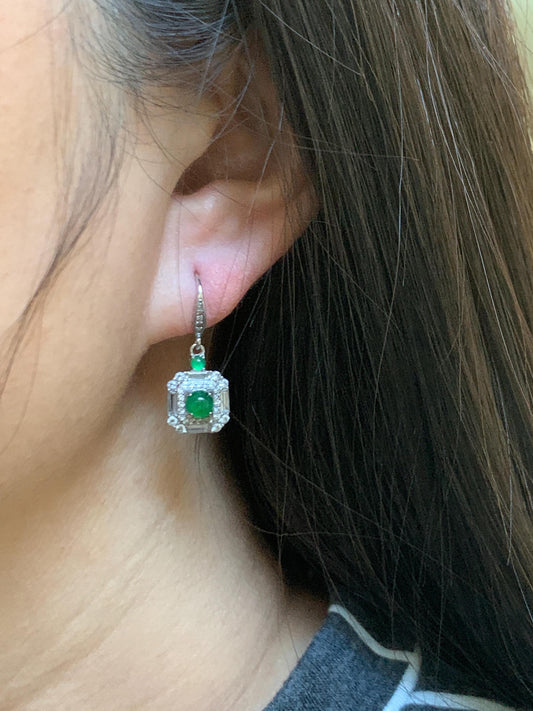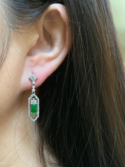 Natural Grade A Guatemalan Icy Translucent Vibrant Green Jade Jadeite Art Deco Style Dangle Earrings Sterling Silver 天然冰危绿翡翠银镶耳钩 ADED88